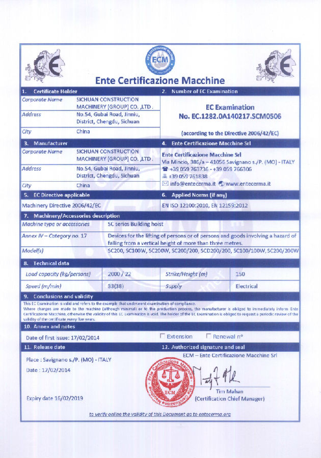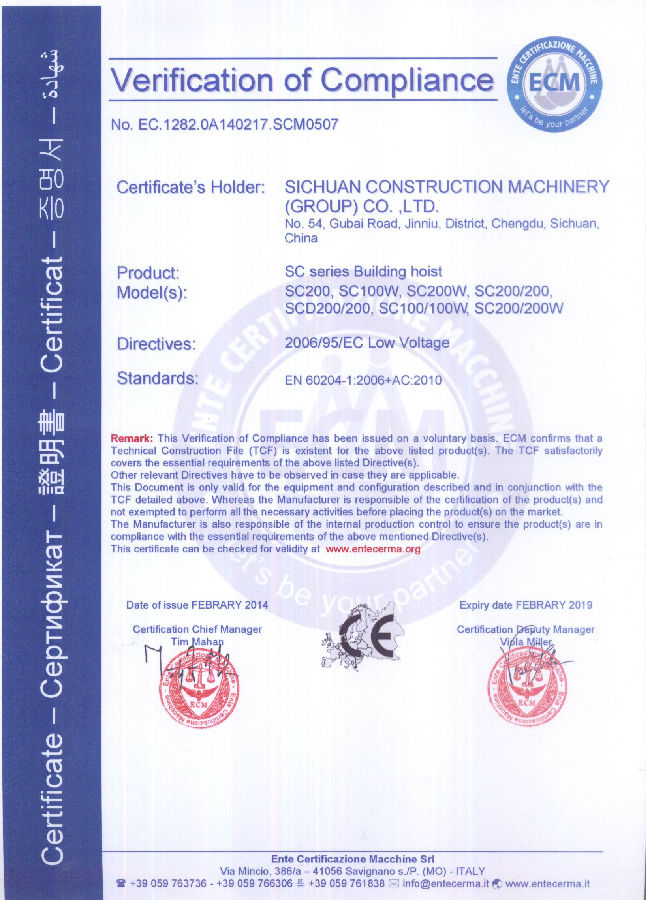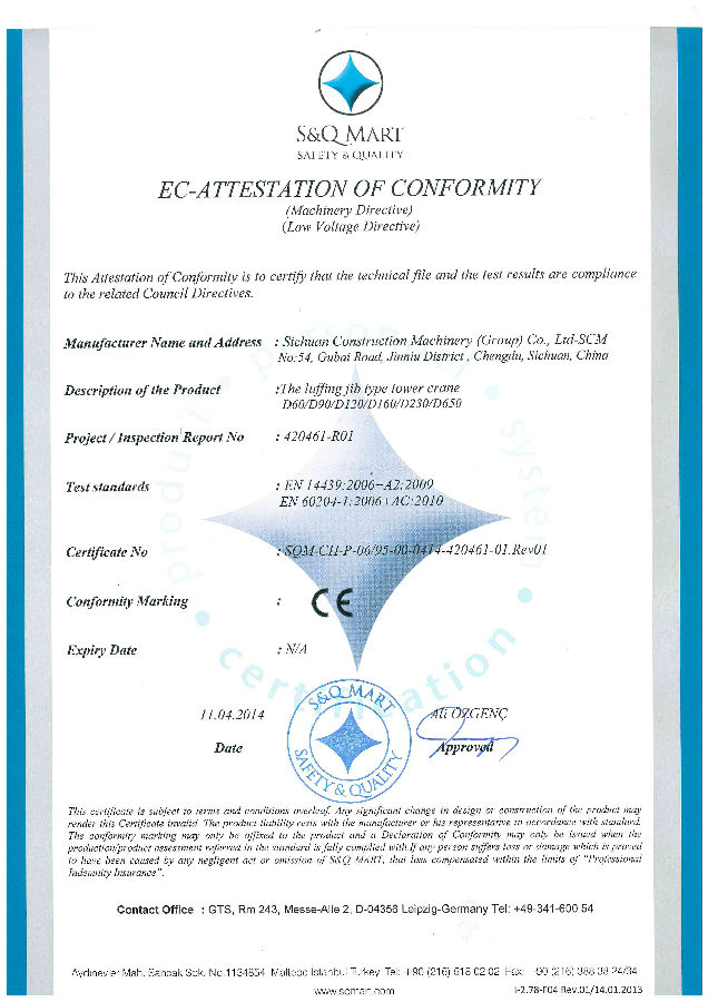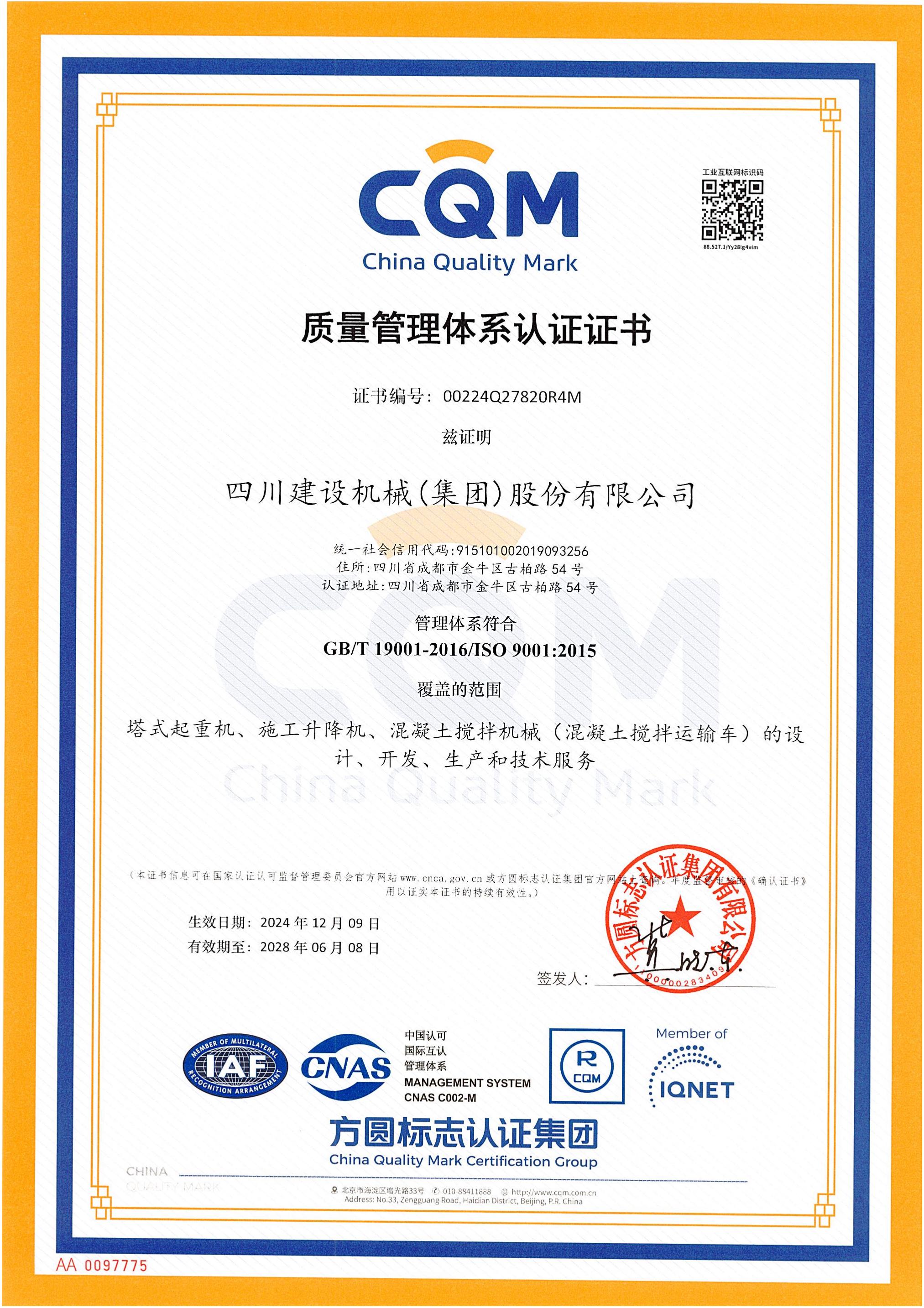 順利通過ISO9001國際質(zhì)量體系認(rèn)證,體系覆蓋產(chǎn)品:塔機(jī)、施工梯、混凝土攪拌機(jī)、膠印機(jī)系列產(chǎn)品;