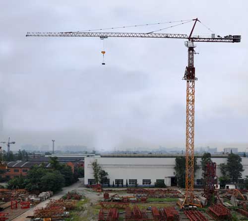 Q6010塔機是一款中小型水平臂塔式起重機。最大起重量6t,端部吊重1t,最大工作幅度60m,標準節為片式1.6m斷面,固定附著式最大起升高度153.7m,配有固定、行走、內爬三種機型。起升、回轉、變幅均采用了變頻無級調速技術。