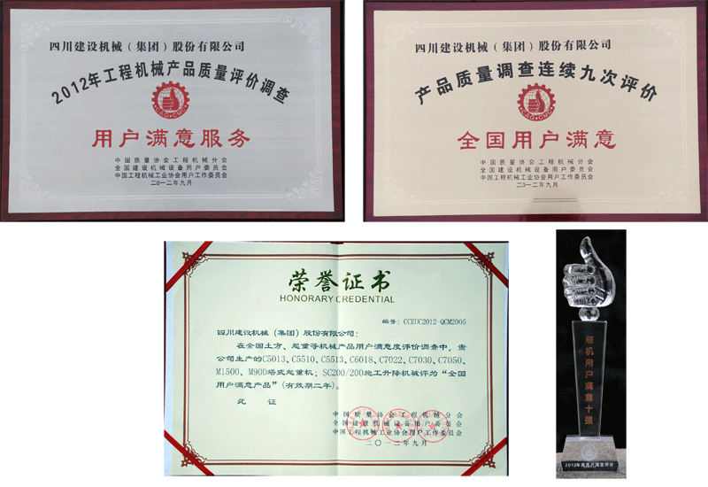 會議上,侯寶佳秘書長公布了用戶滿意產(chǎn)品、滿意服務(wù)企業(yè)及塔機(jī)用戶滿意十強(qiáng)等評選名單,對到會的企業(yè)代表及個人進(jìn)行了現(xiàn)場表彰,并對連續(xù)三次以上獲得用戶滿意產(chǎn)品稱號的企業(yè)進(jìn)行表彰。四川建設(shè)機(jī)械(集團(tuán))股份有限公司在2012年工程機(jī)械產(chǎn)品質(zhì)量評價調(diào)查中獲得“用戶滿意服務(wù)”,迄今為止已經(jīng)是(集團(tuán))公司產(chǎn)品“質(zhì)量調(diào)查連續(xù)九次評價全國用戶滿意”。公司生產(chǎn)的C5013、C5510、C5513、C6018、C7022、C7030、C7050、M900、M1500塔式起重機(jī)以及SC200/200施工升降機(jī)被評為“全國用戶滿意產(chǎn)品”。同時,協(xié)會在用戶滿意產(chǎn)品的基礎(chǔ)上評選出2012年塔式起重機(jī)行業(yè)“全國塔機(jī)用戶滿意十強(qiáng)”企業(yè),包括四川建設(shè)機(jī)械(集團(tuán))股份有限公司、撫順永茂建筑機(jī)械有限公司、中聯(lián)重科股份有限公司、廣西建工集團(tuán)建筑機(jī)械制造有限責(zé)任公司、北京永茂建工機(jī)械制造有限公司、沈陽三洋建筑機(jī)械有限公司、浙江省建設(shè)機(jī)械集團(tuán)有限公司、湖北江漢建筑工程機(jī)械有限公司、浙江虎霸建設(shè)機(jī)械有限公司、江蘇正興建設(shè)機(jī)械有限公司。